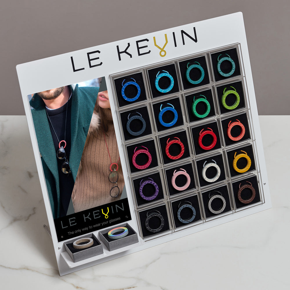 Showcase LE KEVIN eyeglass holders, tag and button holder collections for your customer.